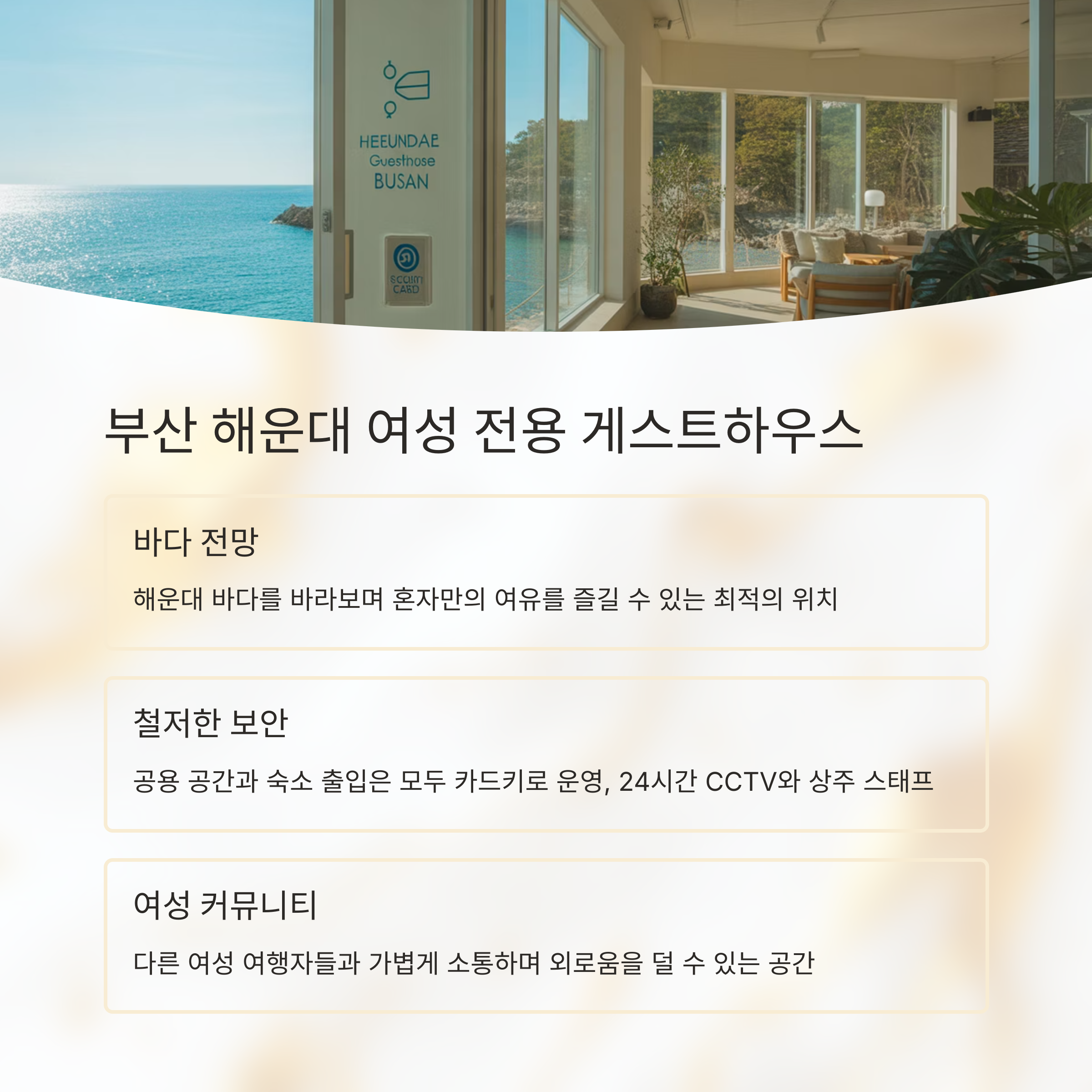 | 부산 해운대 | 여성 전용 게스트하우스 | 카드키 출입, CCTV, 여성 스태프 상주 |